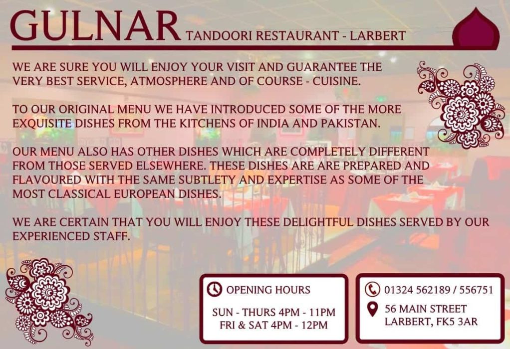 - 2 course lunch from our partners ‘The Gulnar Tandoori’